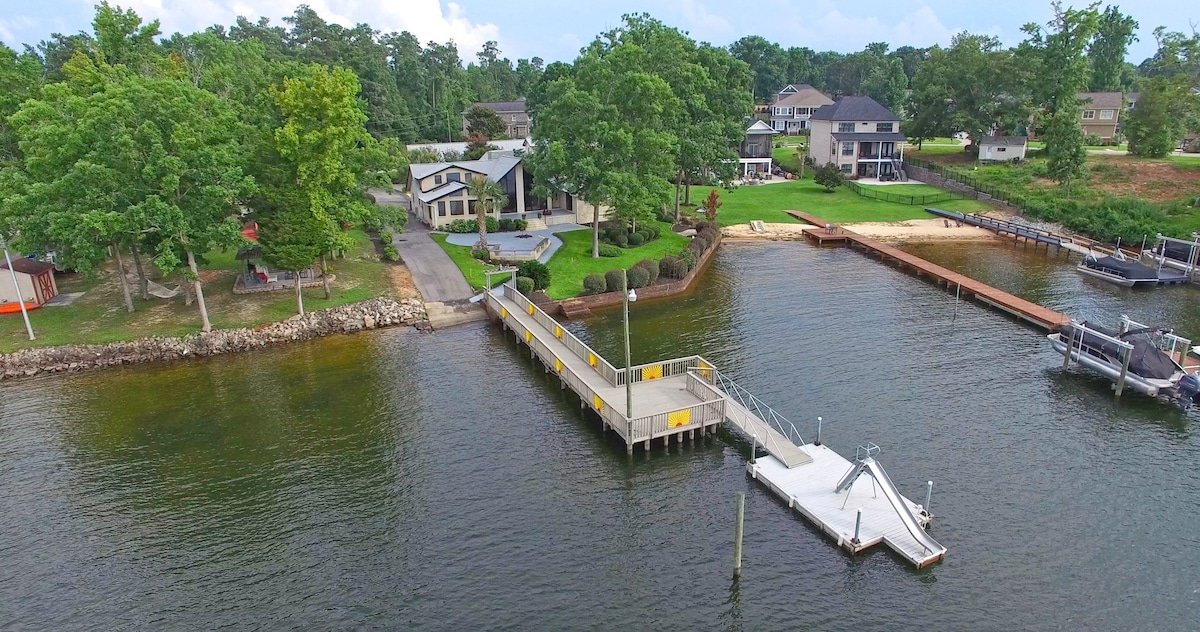 “This a great house in a beautiful setting and accommodated our big group even better than expected. The fantastic dining table fit all of us and led to many stories and laughter. The dock access to the lake was great and a perfect launching spot for fun whether fishing off the dock, enjoying the slide or fun on the paddle boards and kayaks. It even fit the pontoon boats we rented. A great time was had by all. Thanks so much!!!!”