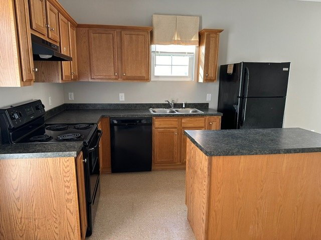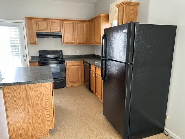 The kitchen is equipped with a refrigerator, stove/oven, and dishwasher.