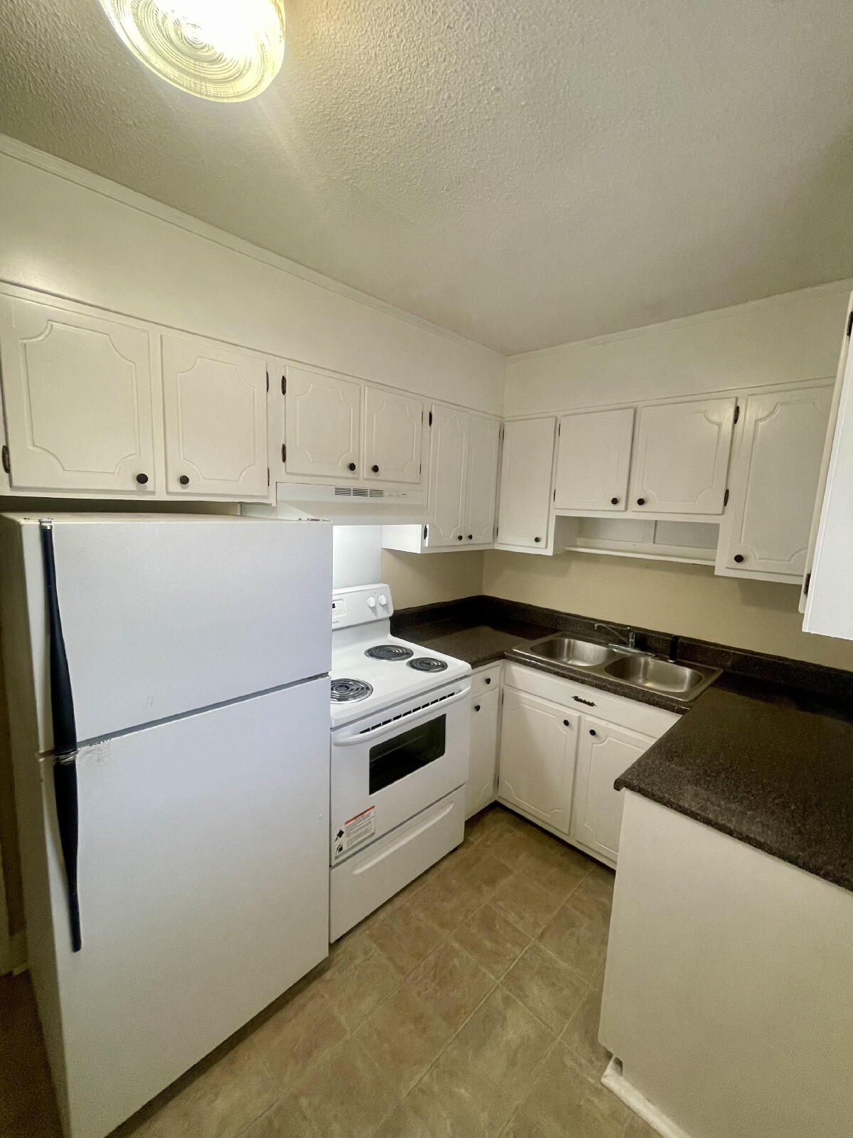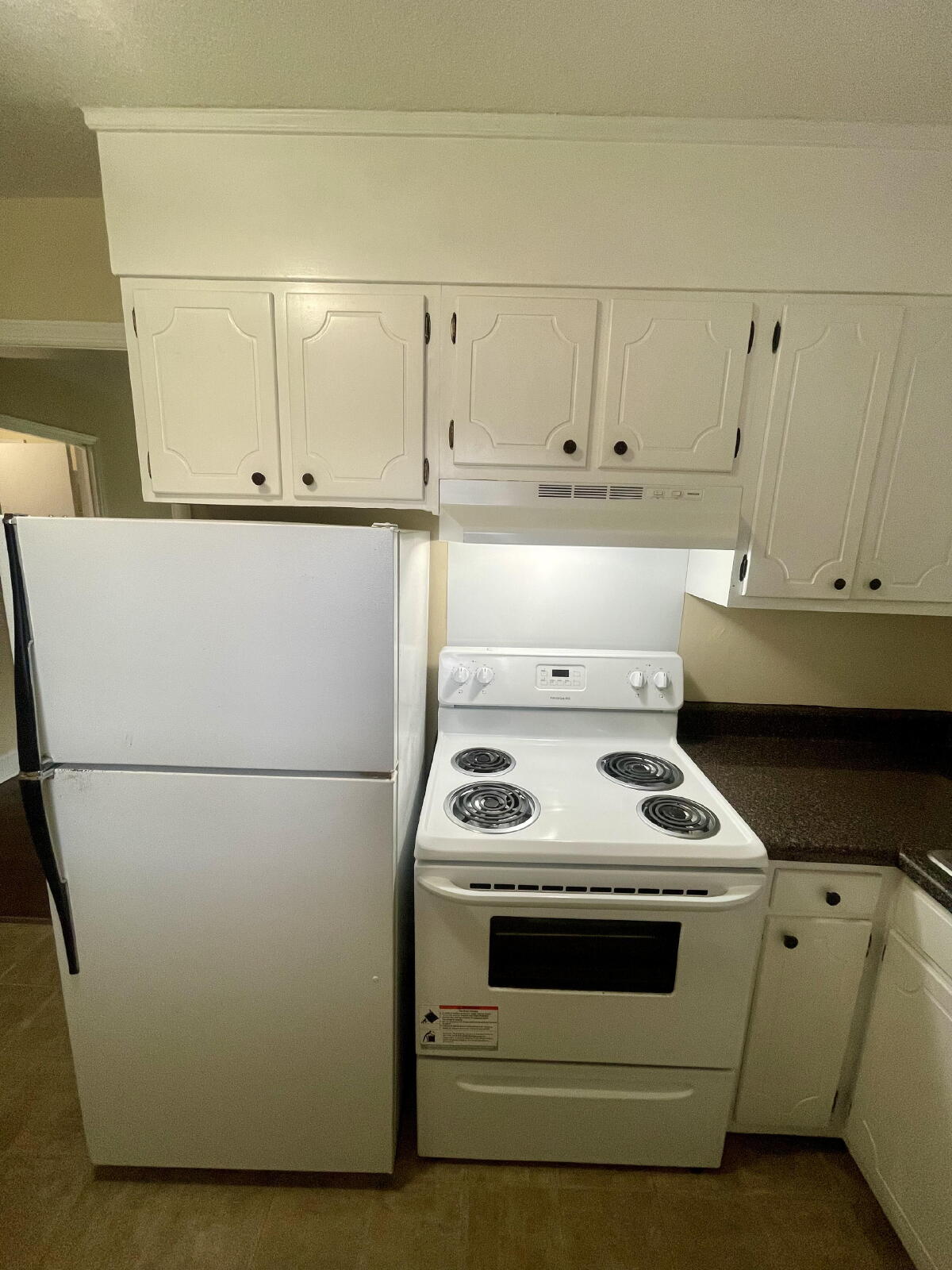 The kitchen includes a refrigerator and stove/oven, with easy access via the back stairwell.