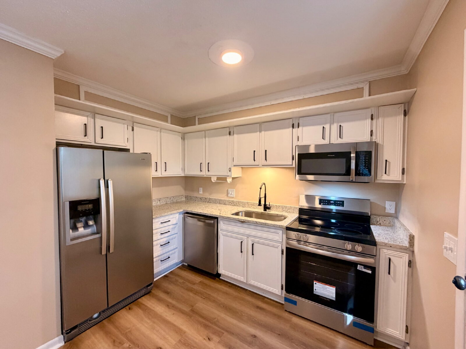 Located at 1216 Grove Park Lane, this well-maintained two-bedroom, one-and-a-half-bathroom townhome offers a comfortable layout with modern updates throughout. The home features durable luxury vinyl plank flooring, updated lighting, and a neutral color scheme that complements a variety of décor styles.