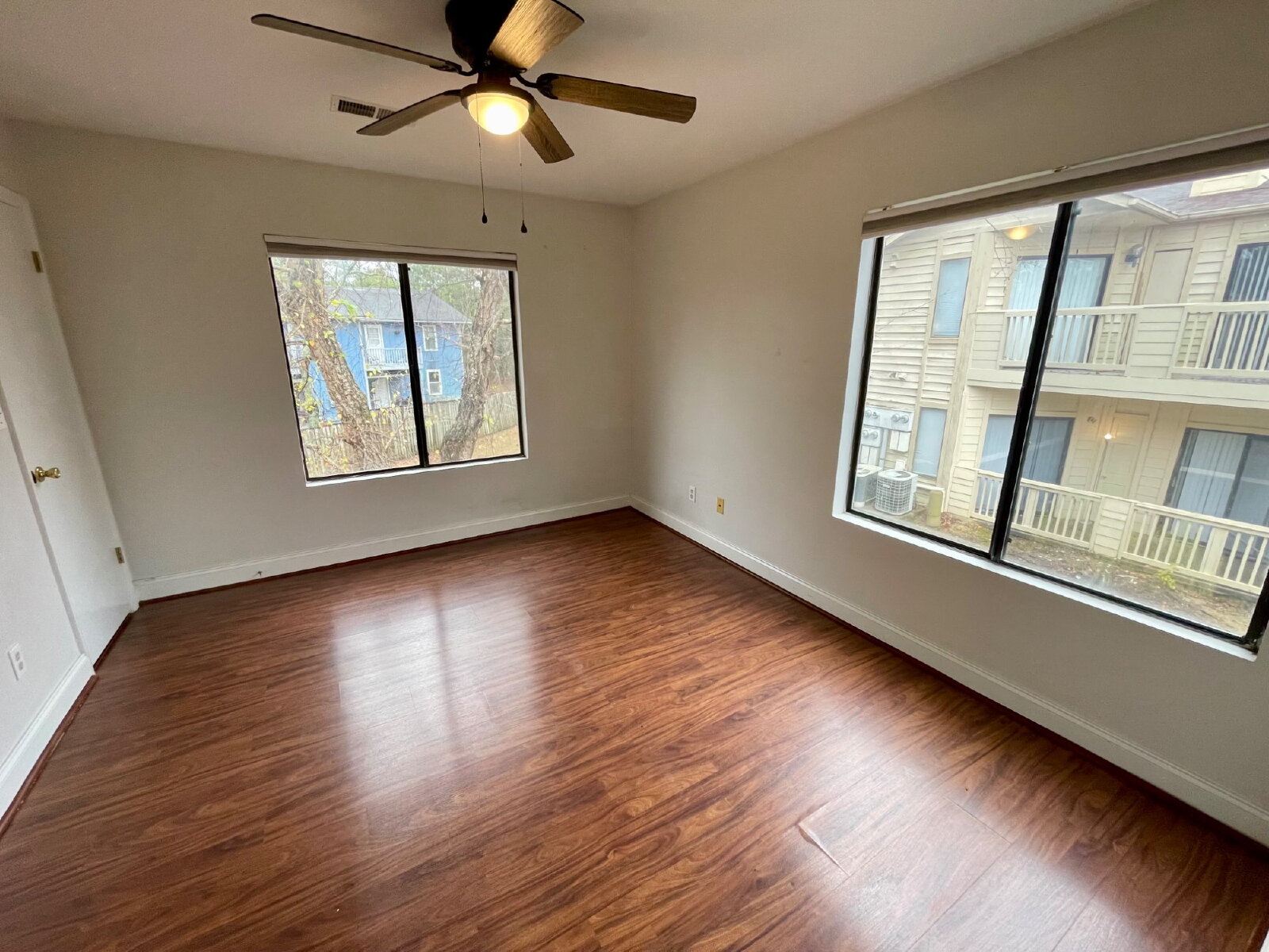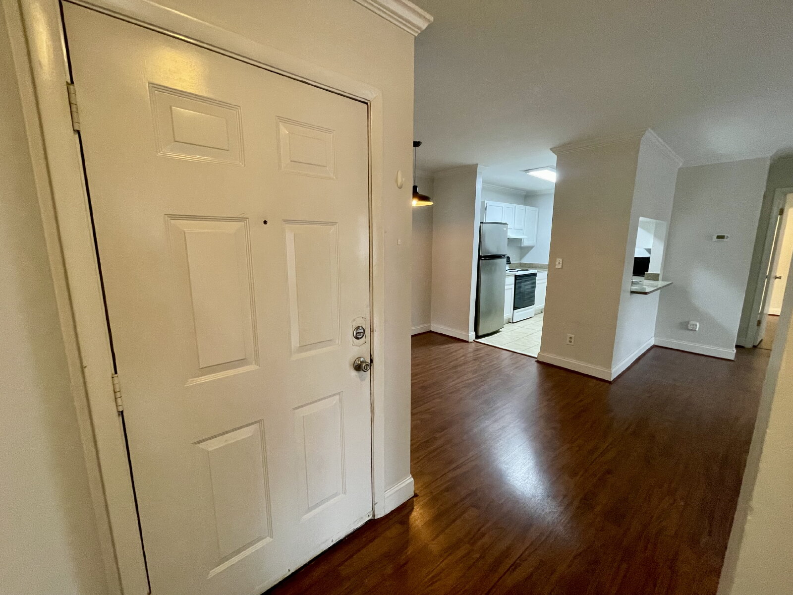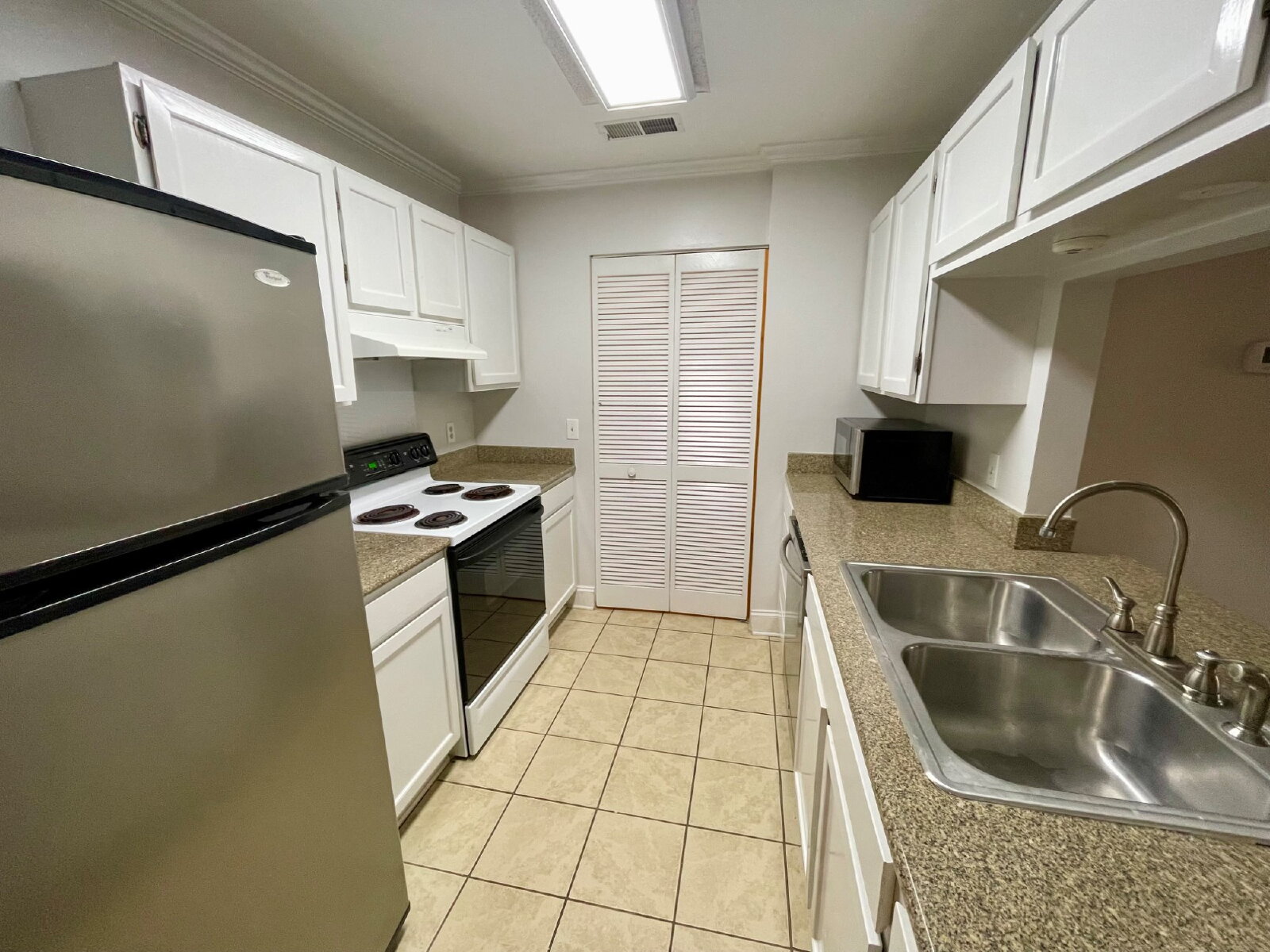 The primary bedroom includes an attached ensuite bathroom and private porch access, creating a comfortable and connected retreat. The second full bathroom is located conveniently off the main hallway, close to the second bedroom for easy access. Both bedrooms offer generously sized walk-in closets, providing ample storage space and enhancing the unit’s functional layout.