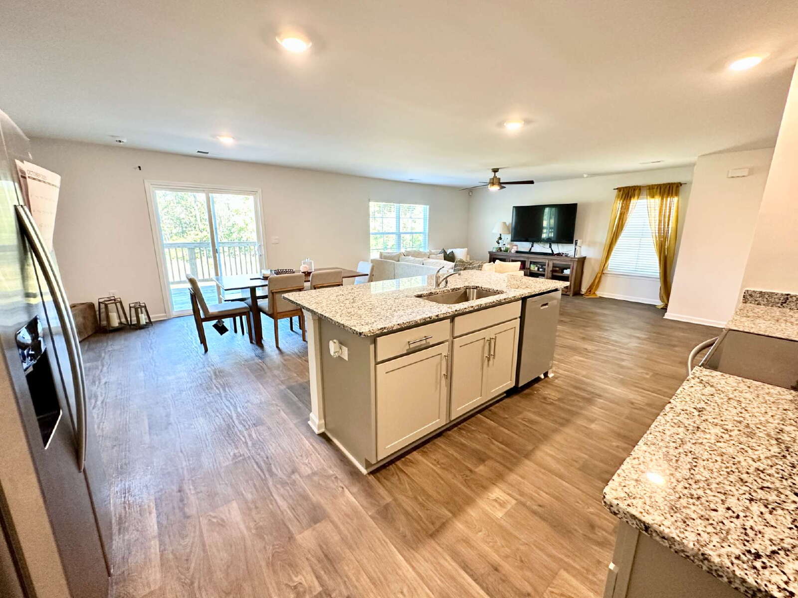 The open-concept main level features a bright family room that flows seamlessly into the kitchen and dining area-ideal for entertaining or relaxing evenings at home. The kitchen includes granite countertops, stainless-steel appliances (refrigerator, stove/oven, microwave, and dishwasher), a spacious island, and generous cabinetry for storage.