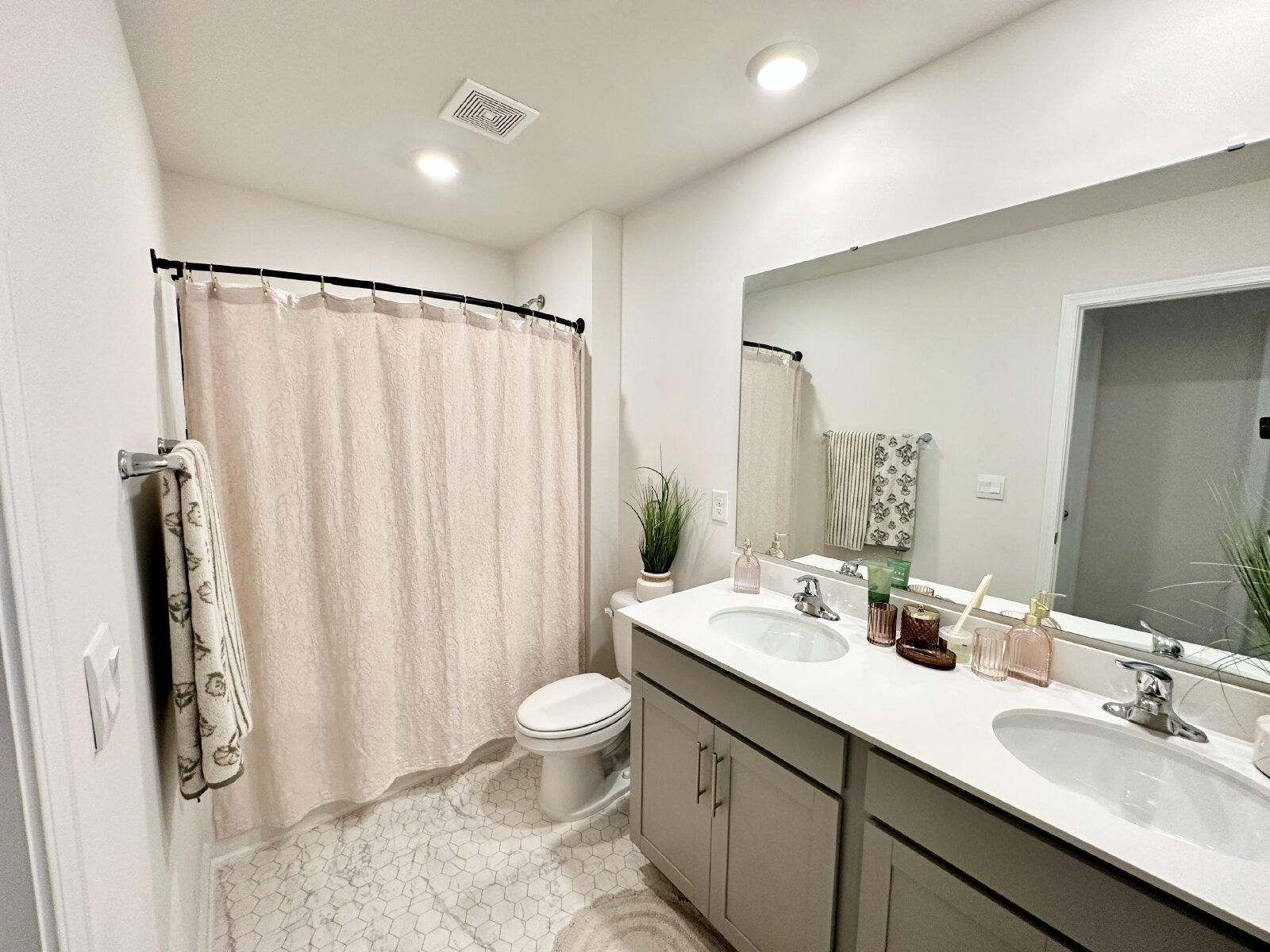 Upstairs, the primary suite provides a peaceful retreat with a large walk-in closet and a private bathroom featuring a dual-sink vanity and oversized walk-in shower. Three additional bedrooms offer flexibility for family, guests, or a home office, and share a well-appointed hall bath with a tub/shower combo.