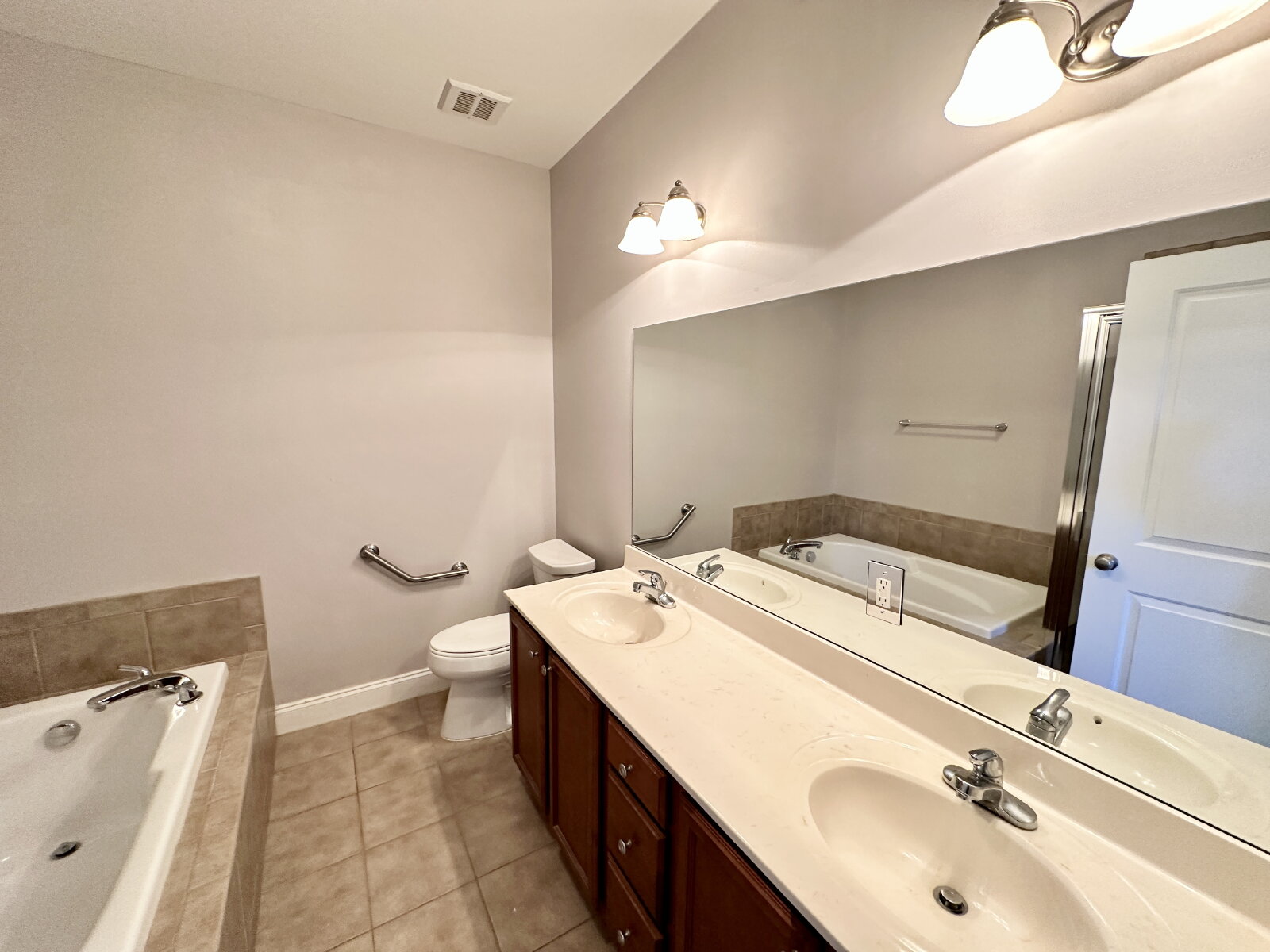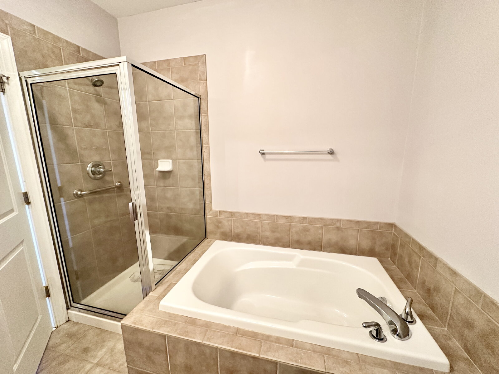 The primary suite features a soaking tub and shower combo, walk-in closet, and soft carpet underfoot for added comfort. A new Samsung washer and dryer are included for your convenience.