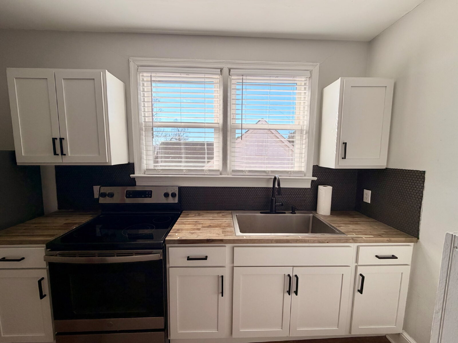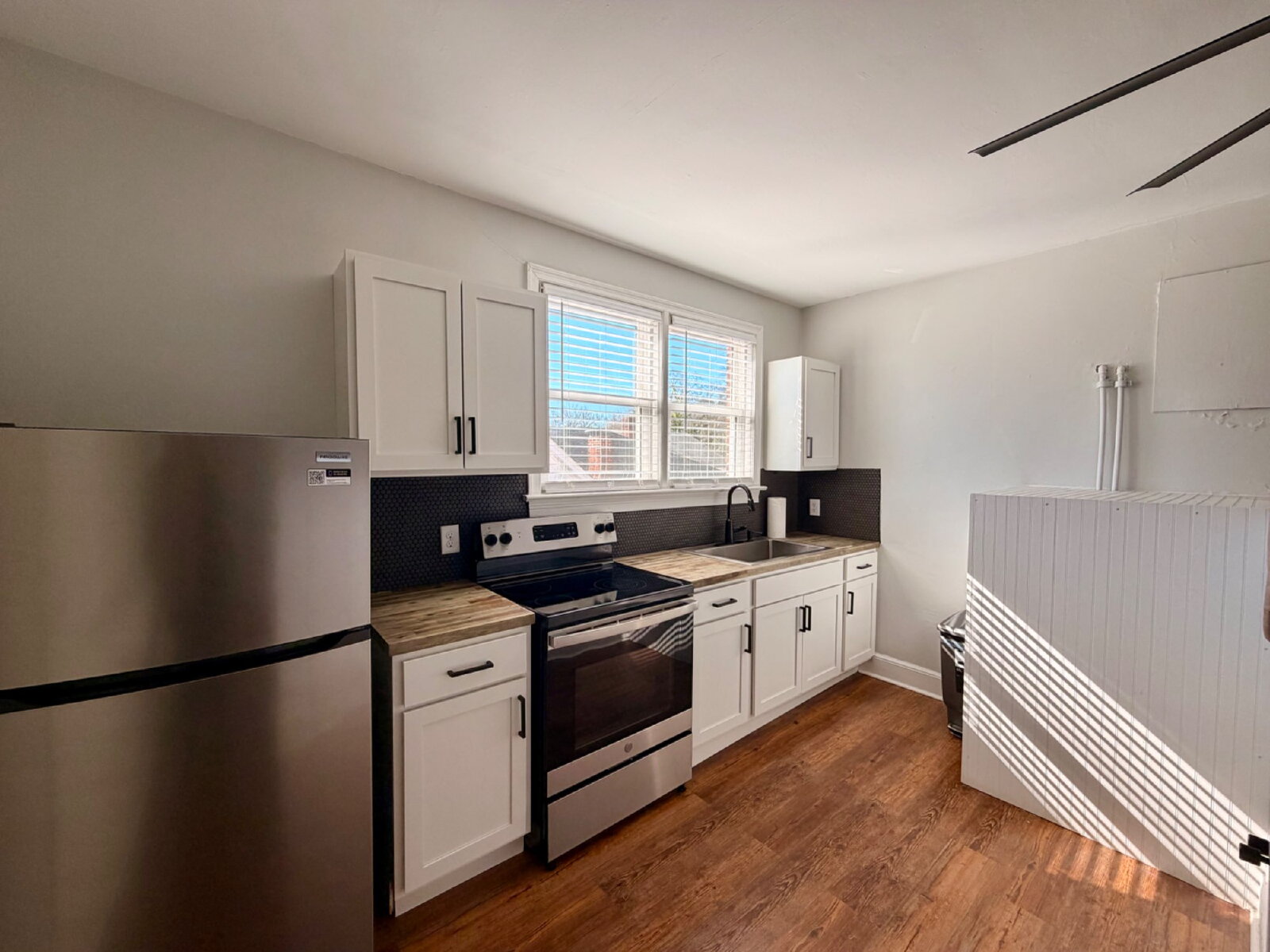 The kitchen is thoughtfully designed with stainless steel appliances (refrigerator and stove/oven), butcher block countertops, and ample cabinet space—perfect for everyday living and entertaining. A washer/dryer hookup (ventless required) is conveniently located within the unit.