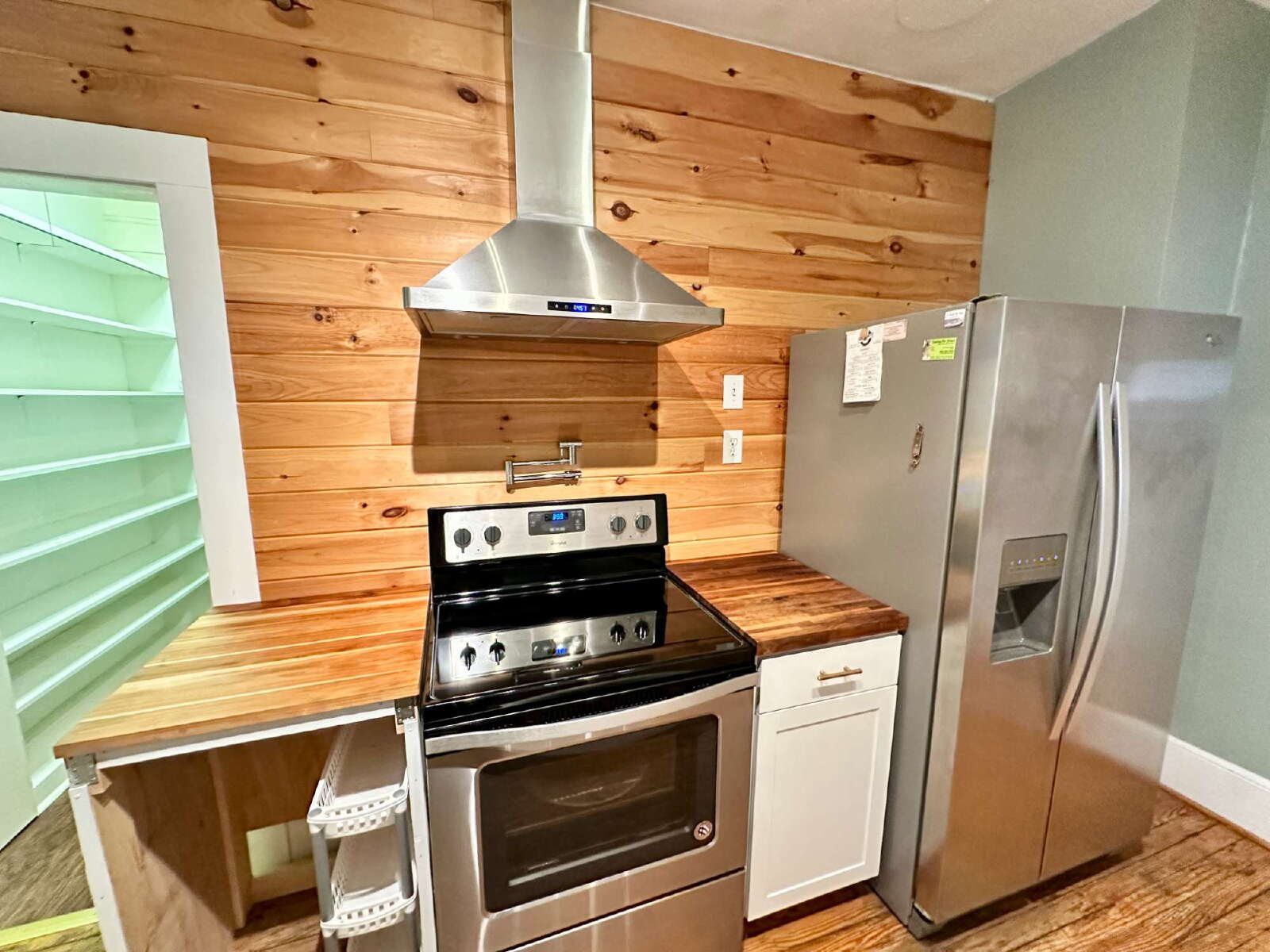 The rustic kitchen includes stainless steel appliances, a pot filler, butcher block/solid surface counters, ample pantry space, and a warm, historic aesthetic that complements the age and charm of the home.
