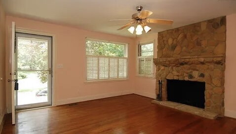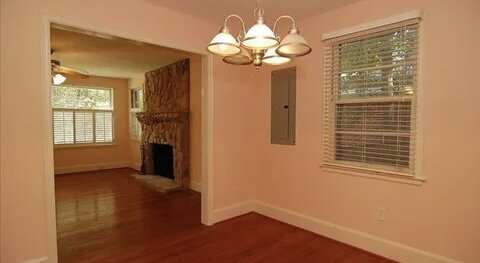 Hardwood floors run throughout the home, and the living area features a beautiful stone fireplace that adds character and warmth. The dining room connects seamlessly to the main living space, creating a functional layout for shared living.