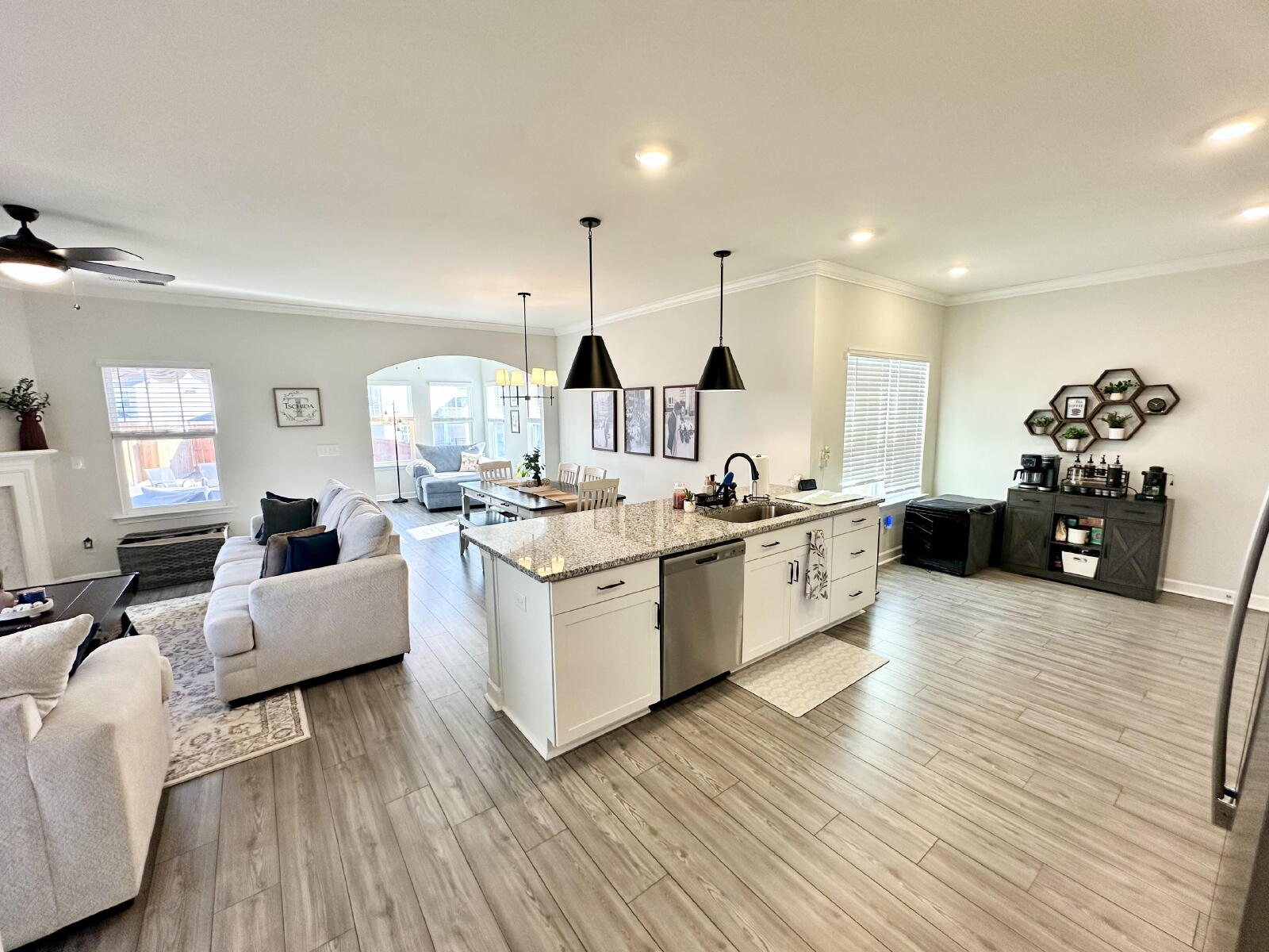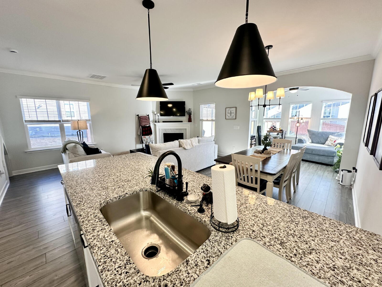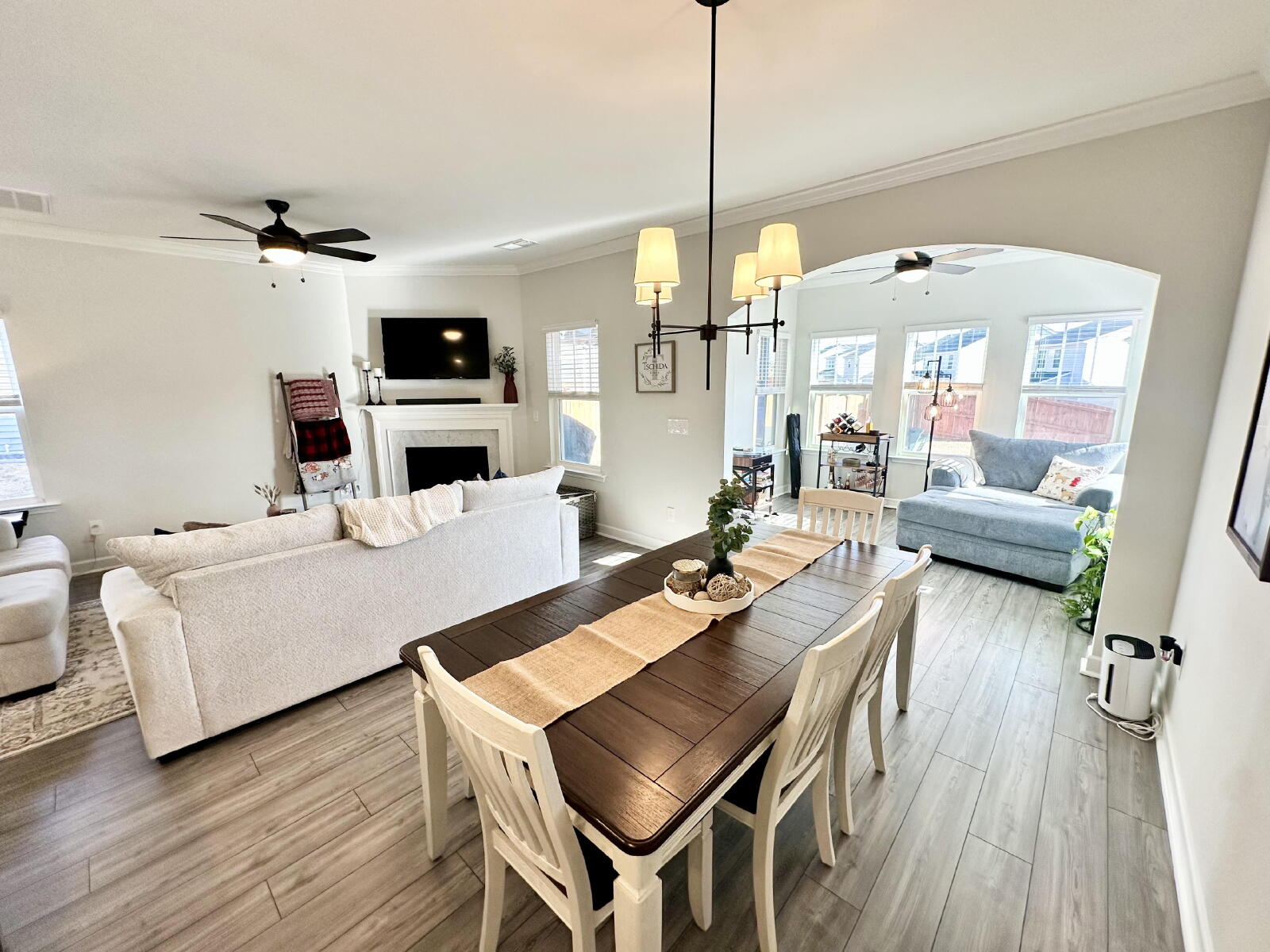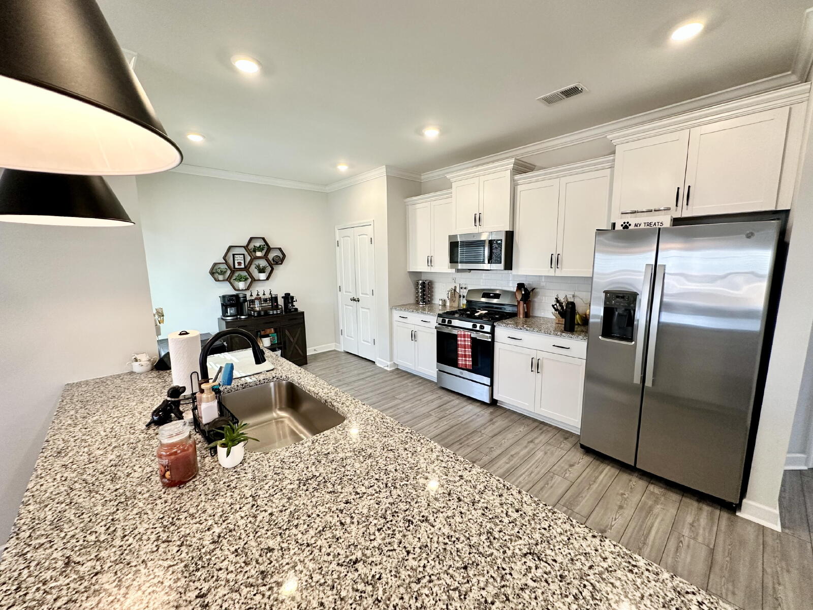 This 3-bedroom, 2.5-bath home with 2,049 square feet offers an inviting open-concept layout perfect for everyday living and entertaining. The main level features a spacious living and dining area that flows seamlessly into a bright sunroom, plus a convenient pet pad for your four-legged companions. The dedicated eat-in kitchen is thoughtfully finished with white cabinetry, granite countertops, a white tile backsplash, pendant lighting over the bar, a pantry, and a gas stove, and it opens to a cozy natural gas fireplace, ideal for relaxing evenings at home. Crown molding throughout the first floor and hardwood tread stairs add a polished, upscale touch.