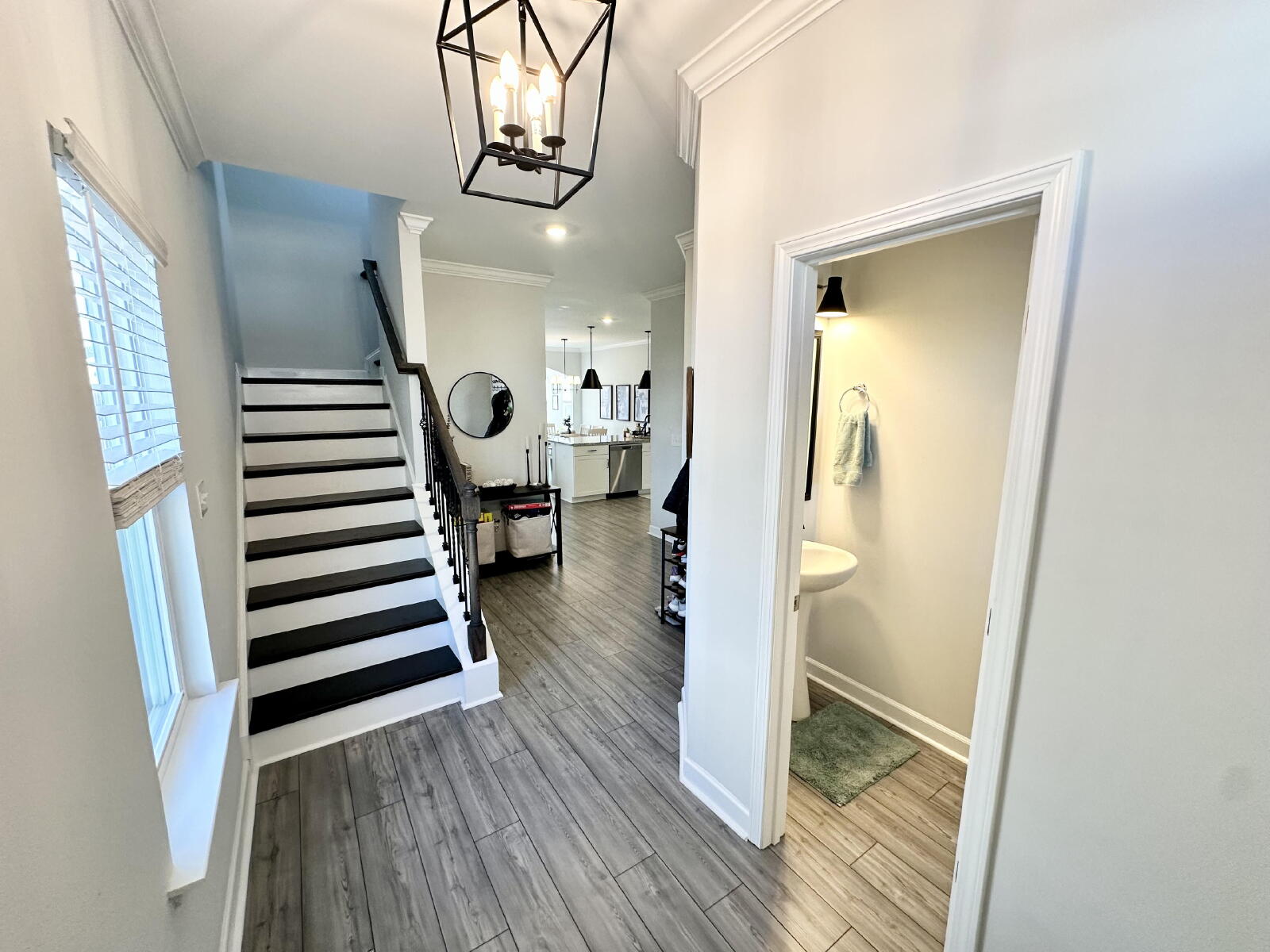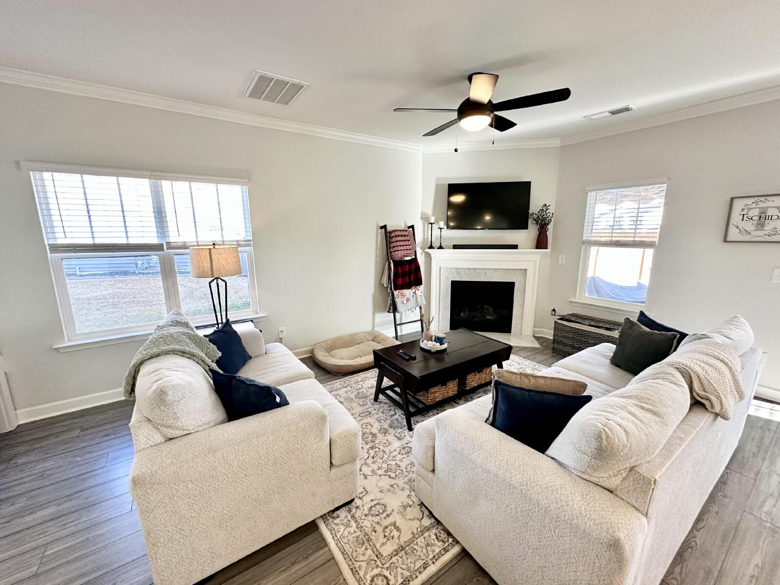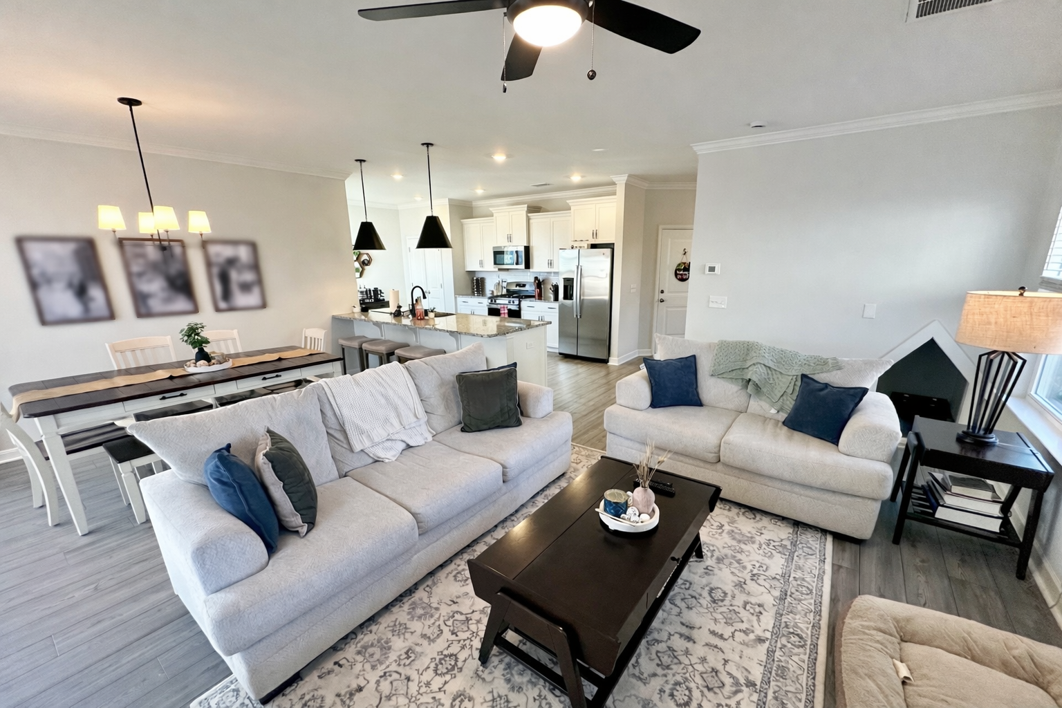 This 3-bedroom, 2.5-bath home with 2,049 square feet offers an inviting open-concept layout perfect for everyday living and entertaining. The main level features a spacious living and dining area that flows seamlessly into a bright sunroom, plus a convenient pet pad for your four-legged companions. The dedicated eat-in kitchen is thoughtfully finished with white cabinetry, granite countertops, a white tile backsplash, pendant lighting over the bar, a pantry, and a gas stove, and it opens to a cozy natural gas fireplace, ideal for relaxing evenings at home. Crown molding throughout the first floor and hardwood tread stairs add a polished, upscale touch.