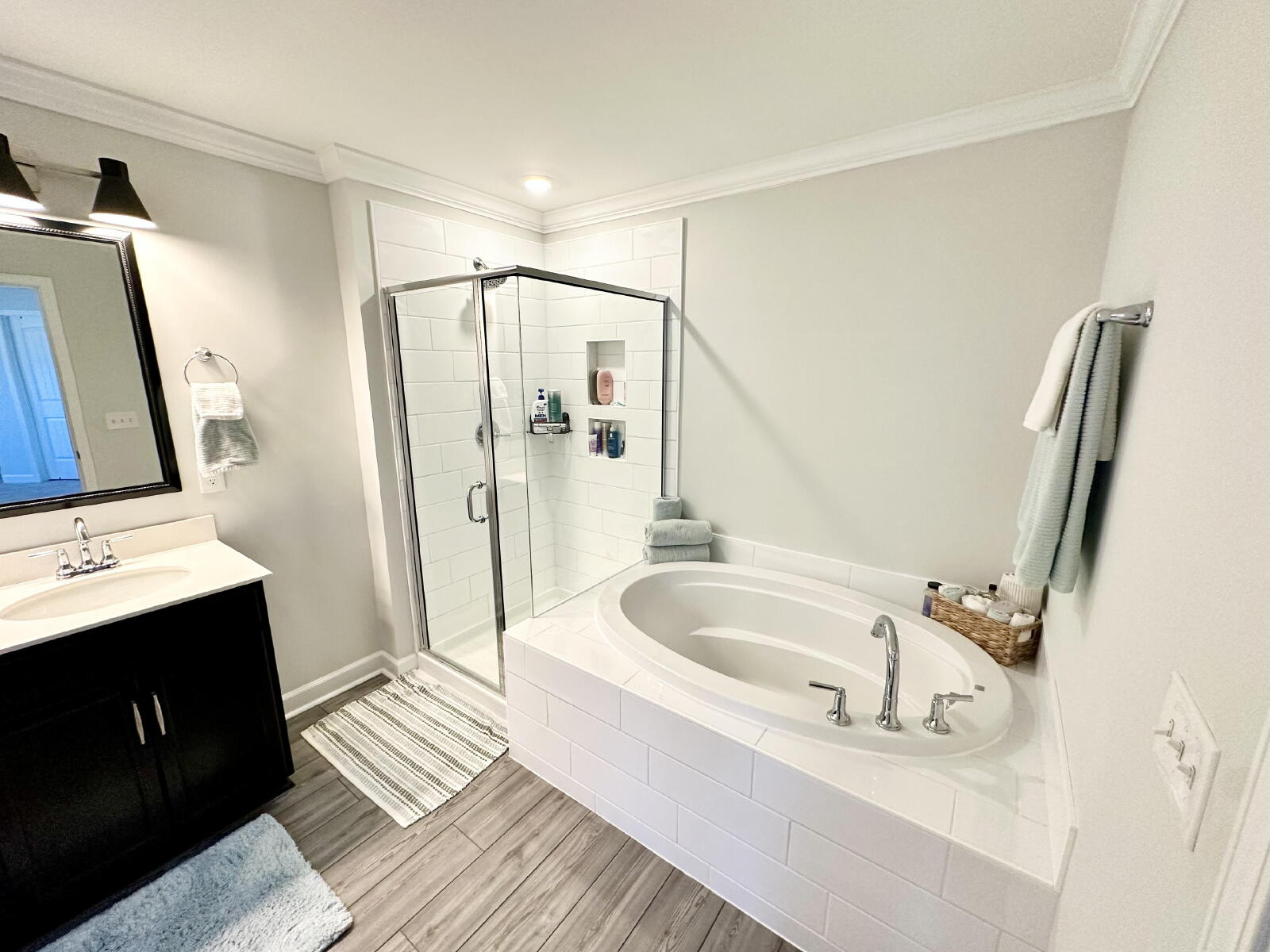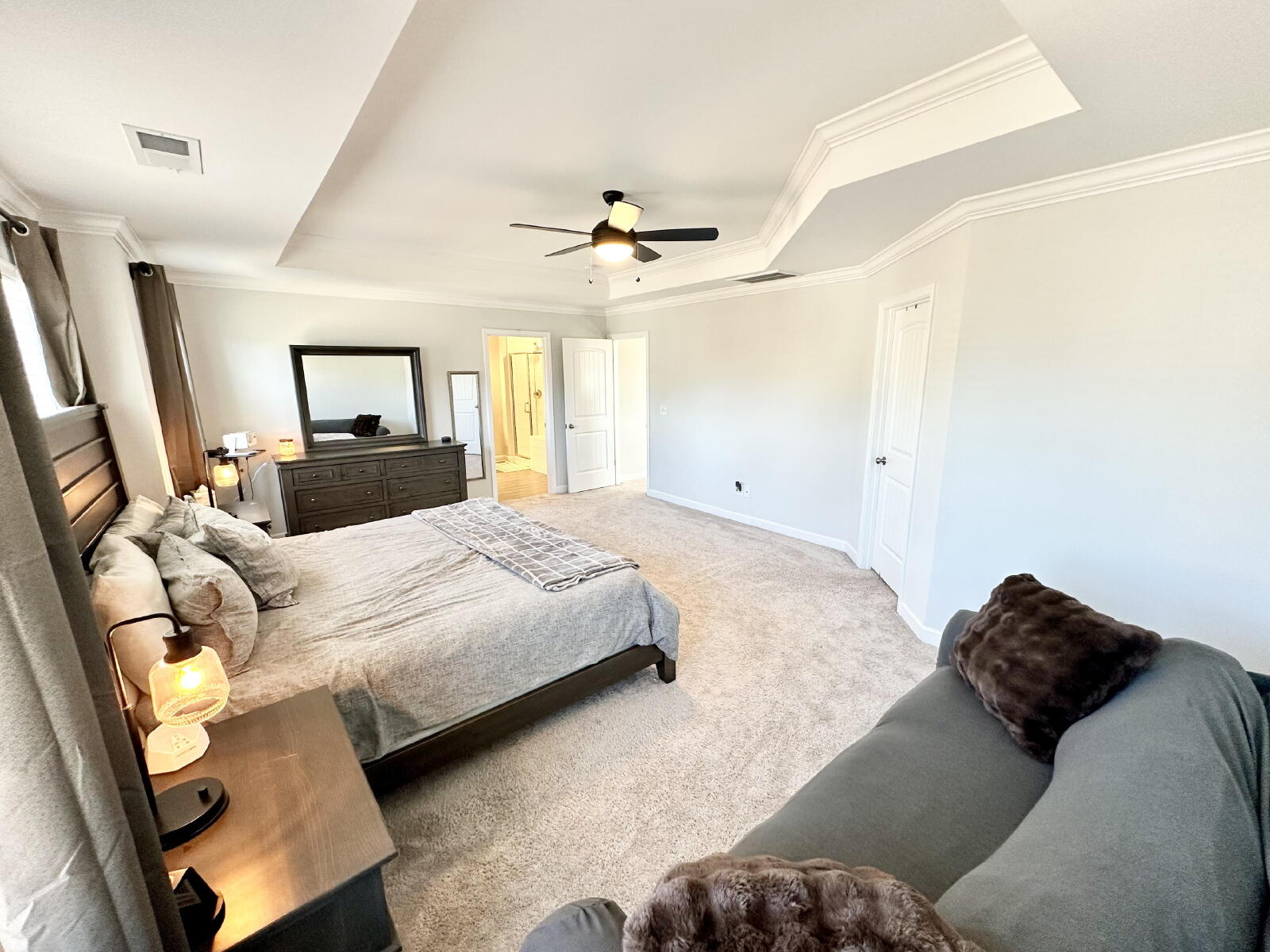 Upstairs, the primary suite is a true retreat with a box ceiling, walk-in closet, dual vanities, and a separate tiled tub and shower. Two additional bedrooms, a full bathroom, a loft/recreation space, and a full laundry room complete the second floor, offering flexibility for work, play, or guests.